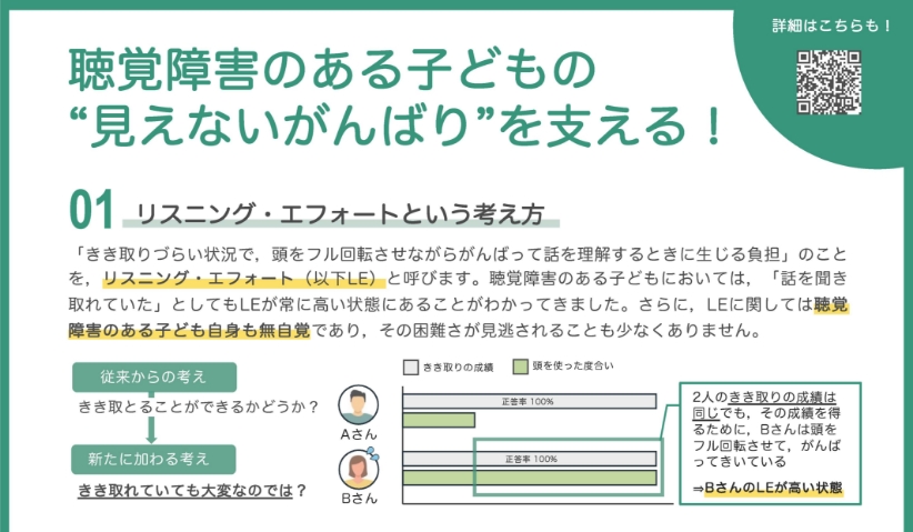 聴覚障害のあるお子さんをお持ちの保護者の方や先生方向けに,リスニング・エフォートについて簡単に説明した啓発用リーフレットです。支援の際などにご活用ください。