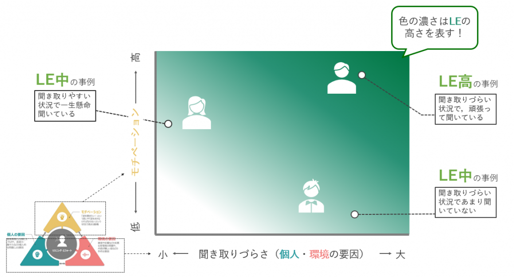 もう1つの図はこれらの関係性をグラデーションで表したものです。ここでは,緑が濃くなれば濃くなるほどエフォートが高いことを意味しています。横軸は「きき取りづらさ(個人+環境)」,縦軸は「モチベーション(やる気)」を表しています。きき取りづらい状況で一生懸命きこうとする場合,当然ですがエフォートは高くなります。一方で「きき取りづらいので,真剣に話をきかなくても良いかな」といったようにモチベーションが低いとエフォートはそんなに高まりません。反対にかなりきき取りやすい状況でも,「この情報は絶対大事だから聞き逃せない」といった状況では,エフォートは高まっていきます。このようにただの聞き取りづらさだけではなくて,自分の意思である程度コントロールできるもの,それがリスニング・エフォートの大きな特徴です。この特徴が支援を行う際の重要なポイントにもなります(リスニングエフォートの支援・付き合い方はこちら)。
