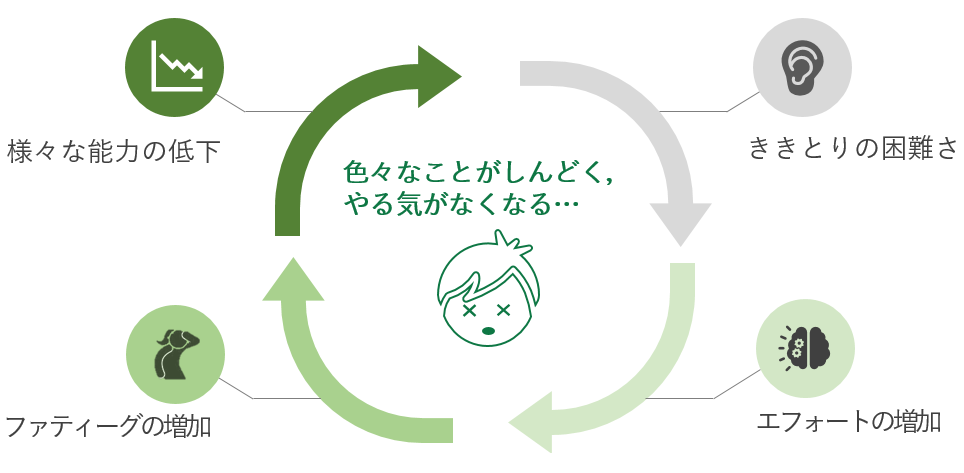 Bess et al.(2014)を参考に,別の観点からも考えてみたいと思います。なんらかの要因できき取りの困難さがあると,モチベーションが高い状況ではリスニング・エフォートが増加します。エフォートが高い状態が続くと,リスニング・ファティーグ(疲労)がたまっていき,その蓄積によって注意や集中力などのさまざまな能力が低下していきます。能力が低下すると,きき取りがより困難になって,さらにエフォートが増加して…という悪循環が生じてしまいます。子どもの場合はこの悪循環が学業成績の不振や登校しぶりにつながったりされると指摘されています。大人の場合でも,この悪循環が続くと,人と会ったり外に出たりすることがおっくうになってしまい,社会的な交流の機会が減少することにもつながると指摘されています。つまり,リスニング・エフォートが高い状態が続くと,気づかないうちに,少しずつ日常生活やウェルビーイング(心身の健康)に影響が出てくることがあります。