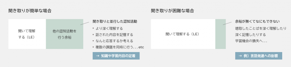 左のように,きき取りが難しくない場合はその容量の半分程度をその場でのきき取り,つまりリスニング・エフォートに割き,残りの半分の容量で,話された内容をより深く理解したり,忘れないように記憶したり,あるいは会話中であればどういう応答をしようか考えたりできます。これらの認知活動が,より深い学習や理解につながっていきます。