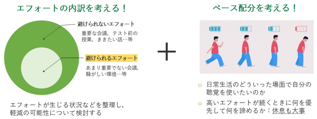 あわせて,マラソンのように自身でペース配分を考えることも重要です。たとえば,自身の生活を見直して,「どの場面で自分が音をきくことに全力を注ぎたいのか」「どの場面で少し力を抜くのか」というようなことをしっかり考えていくことが大切です。何が重要で,何が必要ないのか,さらにどこで集中したいのかといったニーズは一人ひとり異なるかと思います。したがって,当事者の方自身がきこえのペース配分を考えて,意思を決定すると同時に,必要があれば周囲に支援を依頼することが重要になります。